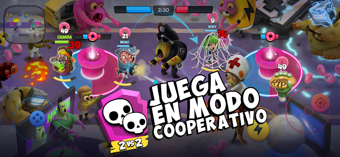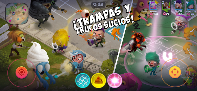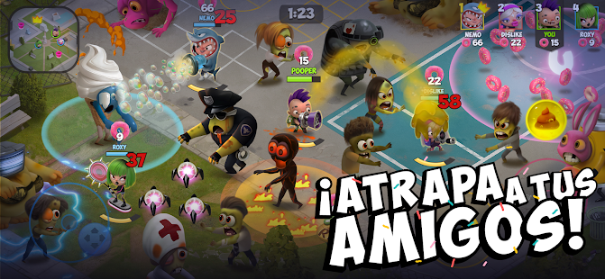 El multijugador PvP tiene historia. Todos los adultos se convirtieron en monstruos peligrosos, pero el misterioso virus no afectó a los niños. Para sobrevivir en nuestro juego de disparos PvP, tienes que recoger el recurso principal del nuevo mundo: los dónuts. Usa tus superpoderes para atrapar a tus amigos. Partidas «battle royale» épicas y divertidas. Elige a los personajes más esperpénticos de todos los juegos de disparos multijugador, cada uno con sus propios ataques y ventajas.