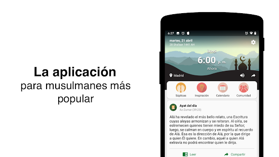 • Adhan: notificaciones visuales y de sonido de las llamadas a la oración con varias voces de muecín a elegir.